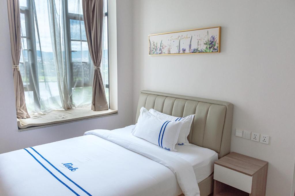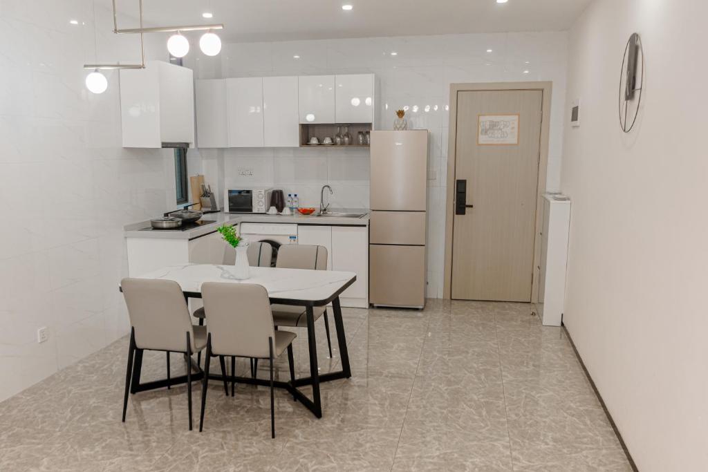 Modern Amenities: The apartment features a kitchenette, balcony, washing machine, and private bathroom. Additional amenities include a dining area, work desk, and city views.
